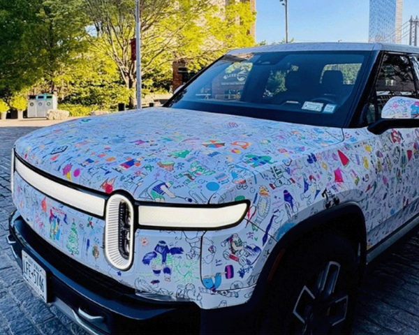Color within the lines of the coloring book wrapped Rivian SUV.
